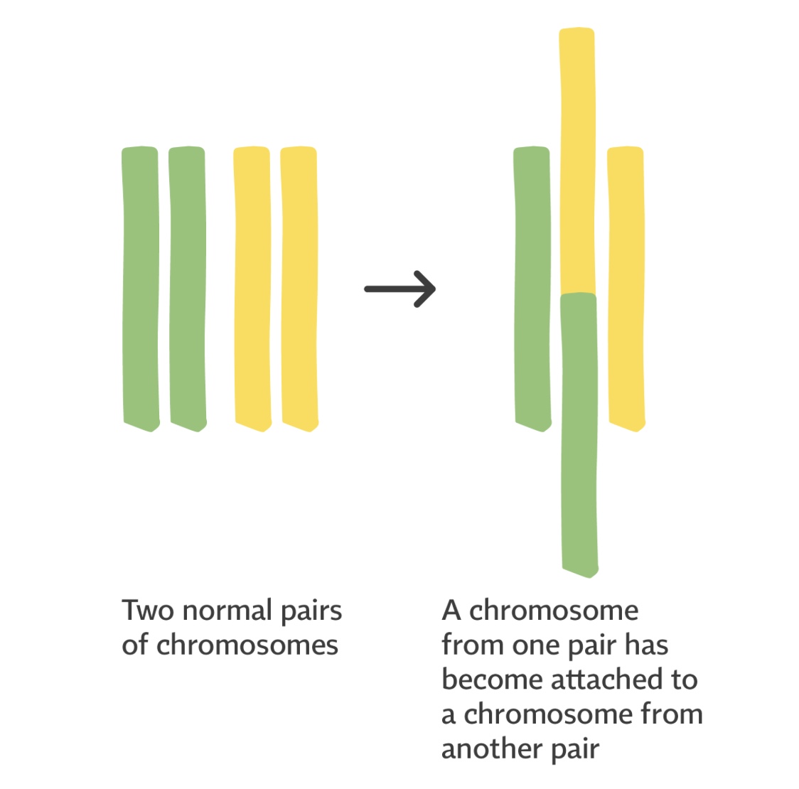 是两条近端着丝(acrocentric)的长臂染色体结合在一起,两个短臂染色体丢失,导致染色体缺少一条,染色体会变成45 条。但是因为大部分的遗传物质在长臂,短臂因为仅携带极少遗传信息即使缺失仍不对身体造成较大影响。